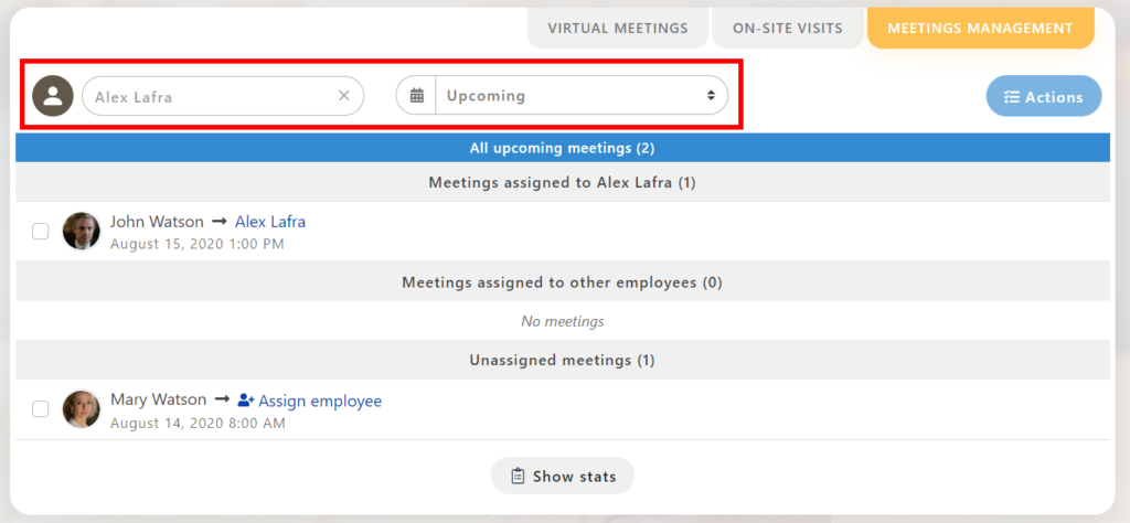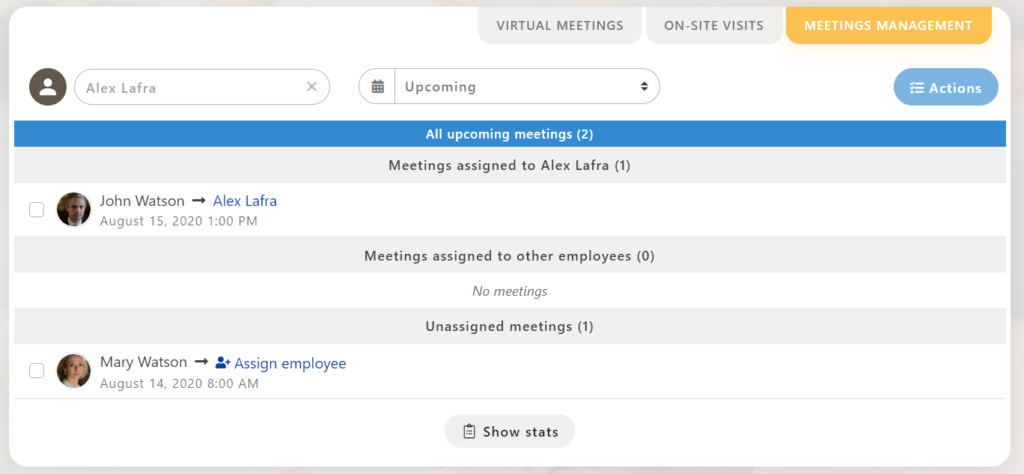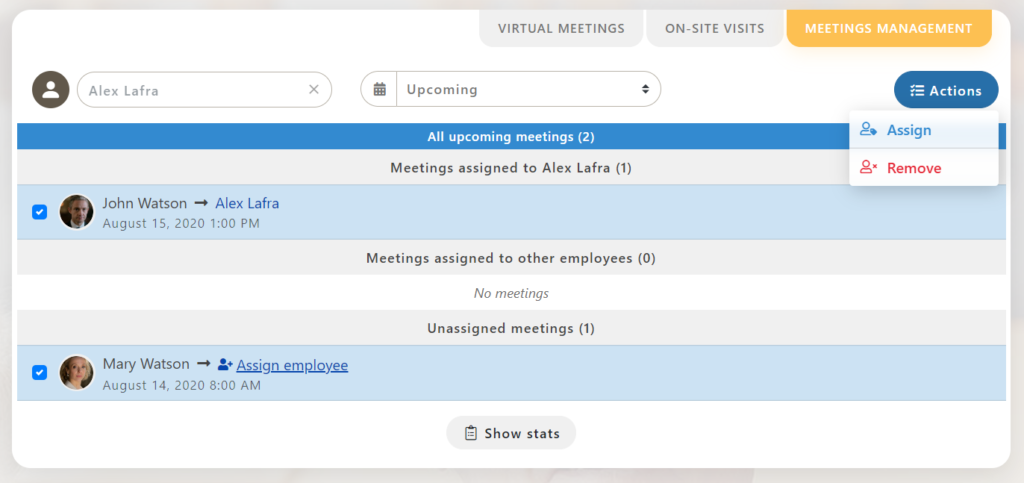 You may select one or more meetings at a time, and assign or remove them from the care of employees.