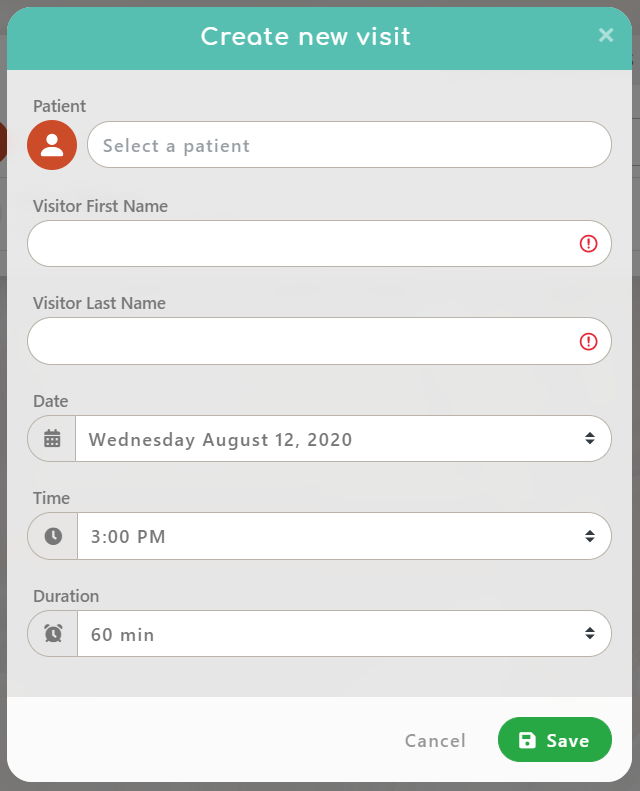 To do so, navigate to the Hours & Meetings page and open the On-site Visits tab. On the top right of the page, you will see a button labelled « Add a visit ». Clicking on it brings up a form to fill out with the patient’s and visitor’s names as well as the visit’s date, time and duration.