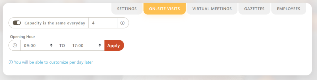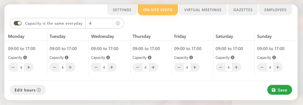 To do so, navigate to the Settings page and open the On-site Visits tab. Once there, you will be presented with a simple interface asking you to enter your general hours for a the week.