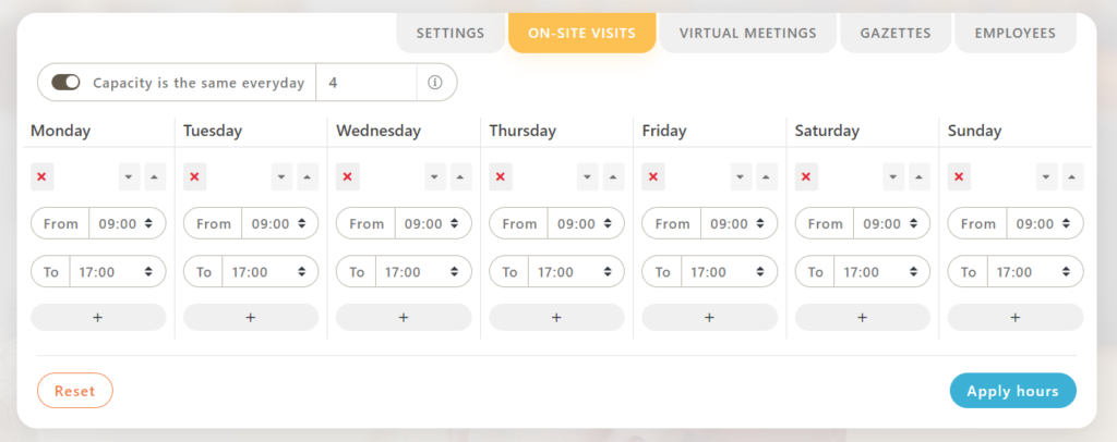 Once applied, you will be shown the hours for everyday of the week. You may customize your hours per weekday or add more timeslots as you see fit. Note that you can always go back to the previous menu by pressing « Reset » while editing the hours.