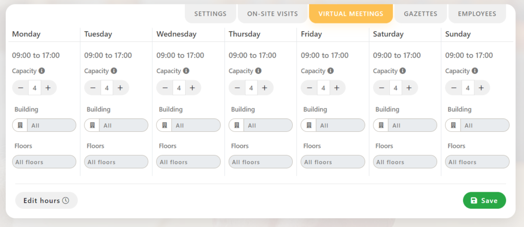 The same process will need to be repeated for virtual meetings. First set your general hours, then configure them for specific days, and lastly, set the maximum number of simultaneous meetings per time frame depending on the number of employees you have available. Additionally, you can specify specific buildings and floors to which to limit the meetings if your employees cannot leave certain areas.