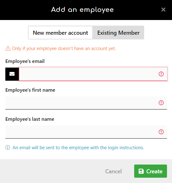 To create a new employee, simply click on the Add employee + button. It will display a window where you can enter all the informations of your employee.
